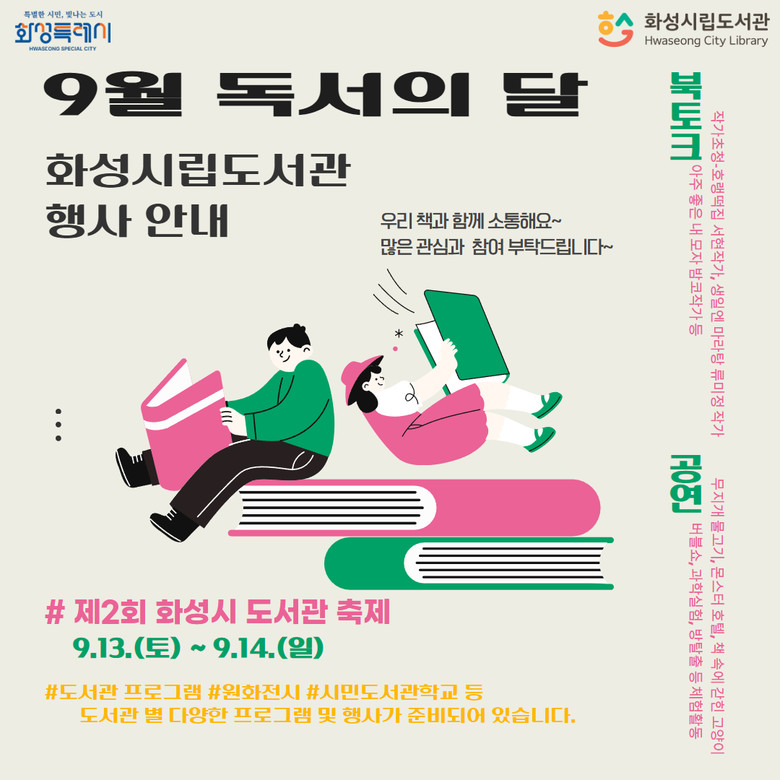 주요 프로그램으로는 ▲병점도서관 20주년 케이크 만들기(병점도서관), ▲참여형 뮤지컬 ‘책 속에 갇힌 고양이’(다원이음터도서관) ▲무지개 물고기 독서 연계 공연(남양도서관) ▲호랭떡집 서현 작가와의 만남(향남복합문화센터도서관) ▲독서텐트 대여 및 야외방탈출(삼괴도서관) 등이 마련돼 있다.