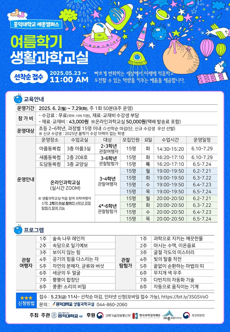 각 프로그램별 운영일정과 모집인원 등 세부 사항은 안내 포스터와 카카오톡 채널 ‘홍익대학교 세종캠퍼스 생활과학교실’을 확인하거나, 전화(☎044-860-2060)로 문의하면 된다.