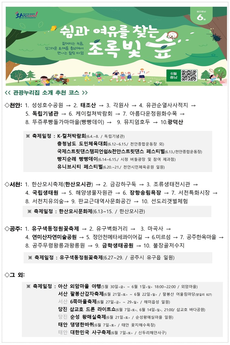 6월 주제는 ‘쉼과 여유를 찾는 초록빛 숲’으로, 짙어지는 녹음 속에서 여유를 즐길 수 있는 천안, 서천, 공주의 주요 관광지를 소개한다.