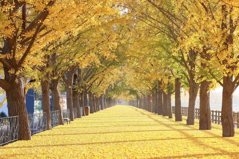 아산 곡교천 은행나무길은 산림청 선정 ‘전국 아름다운 10대 가로수길’ 중 하나로 2.1㎞ 구간에 60년 이상 자란 350여 그루의 은행나무가 늘어서 있고 이 중 180여 그루는 곡교천변을 따라 노란 물결을 이룬다.