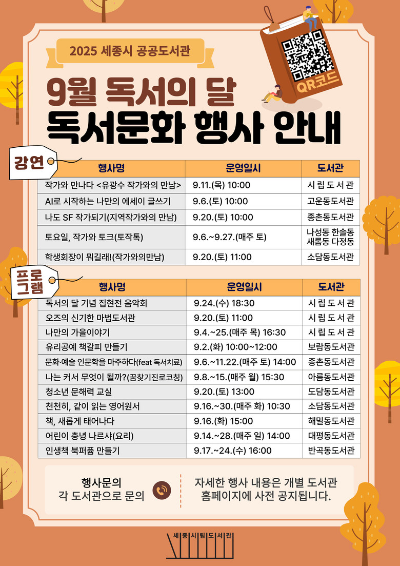 강연과 프로그램 운영 일시와 개최 장소 등은 모두 상이하므로 자세한 사항은 시 통합도서관 누리집(lib.sejong.go.kr/portal)에서 확인하면 된다.