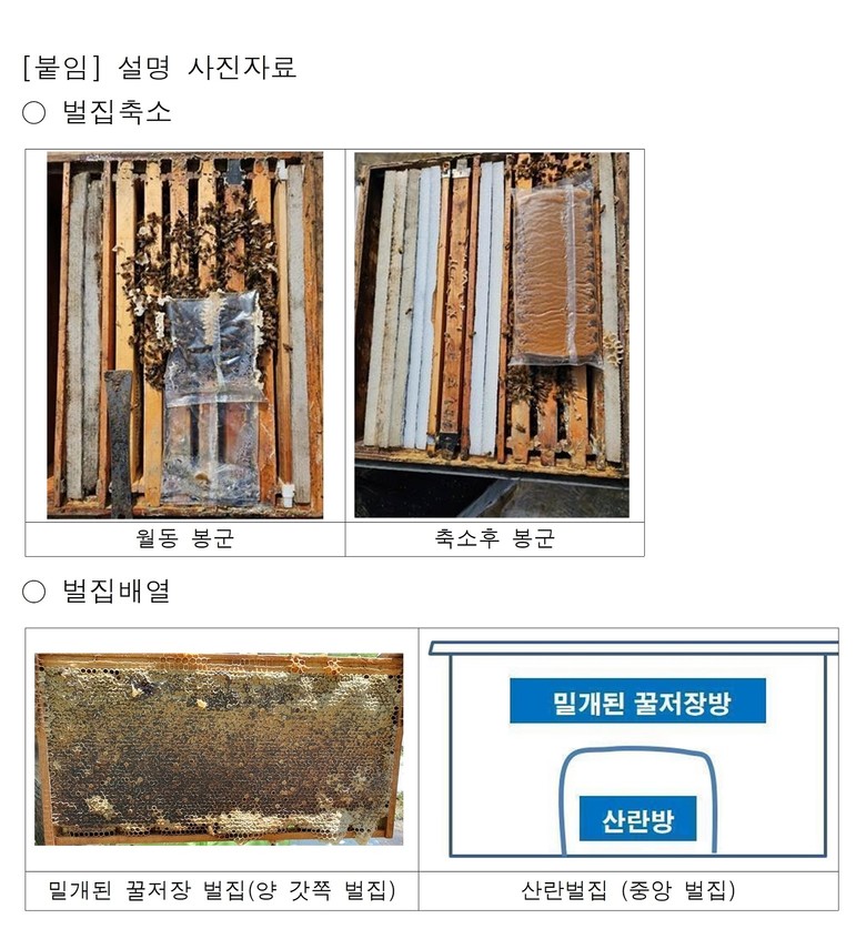 이때 여왕벌의 존재를 먼저 확인한 뒤 벌집당 벌 수를 기준 대비 약 150% 수준으로 조절해 축소한다.