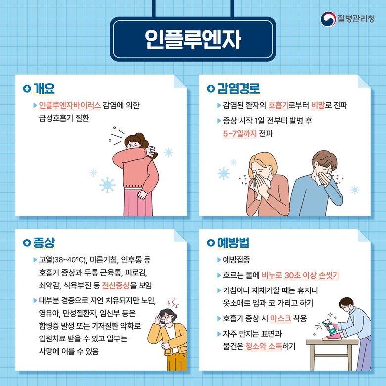 독감을 예방하기 위해서는 ▲흐르는 물에 비누로 30초 이상 손 씻기 ▲기침·재채기 시 마스크 착용 ▲발열이나 호흡기 증상 발현 시 의료기관 방문 등을 준수해야 한다.