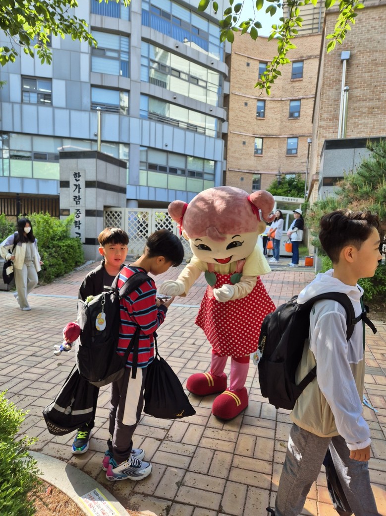 한가람초등학교는 매일 아침 교장선생님과 교감선생님이 도담길 아침맞이를 진행하고 있다. 오늘은 어린이날을 맞이하여 보다 특별한 아침맞이를 준비했다. 교장선생님과 교감선생님이 다오와 샌디로 변신하여 아이들을 맞이하였다. 어린이날 선물로 다오 교장선생님과 사진도 찍고 학교에서 선생님들이 준비한 작은 선물도 받으며, 학교는 행복하고 즐거운 곳이고, 함께 배움과 즐거움으로 성장하는 곳이라는 메시지를 함께 전달할 수 있었다.