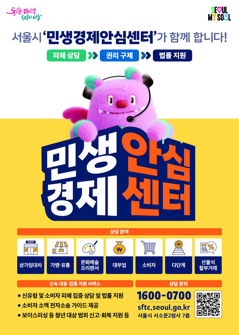 ‘민생경제안심센터’는 전화(1600-0700), 누리집(https://sftc.seoul.go.kr), 방문(서소문2청사 7층)을 통해 이용할 수 있다.