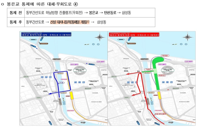 - 공사 계획에 따라 7일(화) 10시부터 봉은교·탄천동로 통제 시작