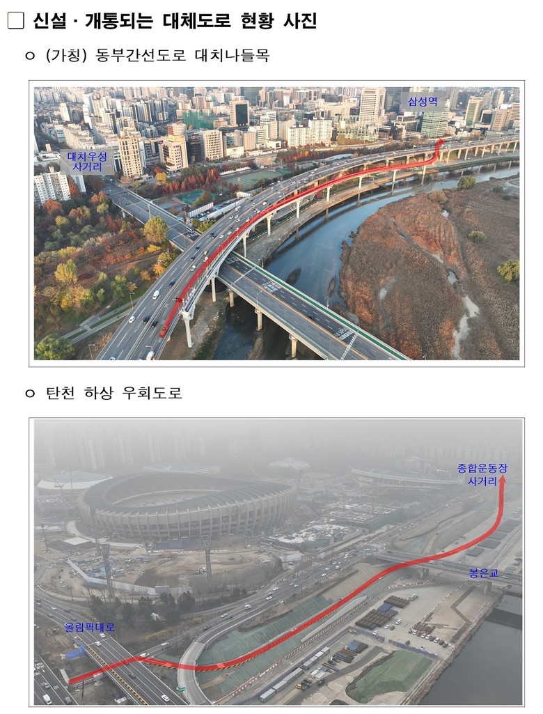 - 공사 기간 동안 신설·개통(동부간선 대치나들목, 탄천 하상 우회도로)하는 대체도로 이용 당부