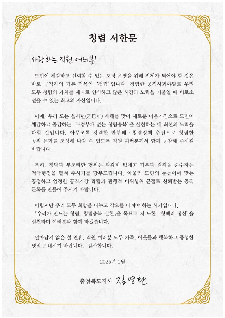 김영환 지사는 “어렵지만 우리 모두 희망을 나누고 각오를 다져야 하는 시기”라면서, “을사년 새해를 맞아 새로운 마음가짐으로 도민이 체감하고 공감하는 부정부패 없는 청렴 충북을 실현하는 데 나부터 솔선수범하겠다. 직원 여러분도 모두 동참하여 주시길 당부드린다.”고 밝혔다.
