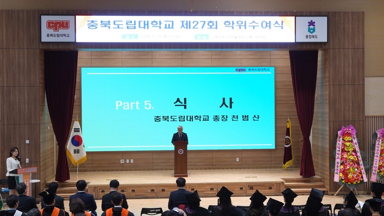 천범산 총장은 “도민의 염원 속에 설립된 충북도립대학교의 전통을 이어받아, 여러분 한 분 한 분이 우리 사회와 지역의 발전을 이끄는 원동력이 되어주시길 소망한다”고 말했다.