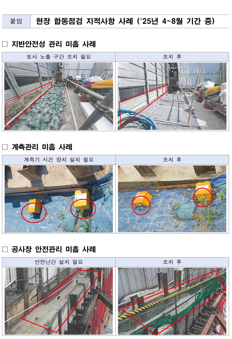 주요 지적 사항은 ▴흙막이 벽체나 차수 공법 등에 대한 지반 안전성 관리 미흡(84건) ▴계측기 보호·잠금 장치 등 관리 소홀(39건) ▴안전망 미설치 등 공사장 안전관리 미흡(98건) ▴기타(21건) 등이다.