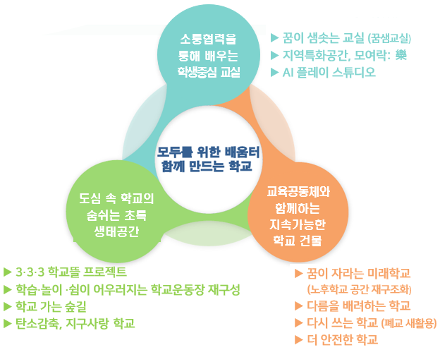 3대 핵심전략은 △소통.협력을 통해 배우는 학생중심 교실 조성 △교육공동체와 함께하는 지속가능한 학교 건물 구축 △도심 속 학교의 초록 생태공간 조성이다.