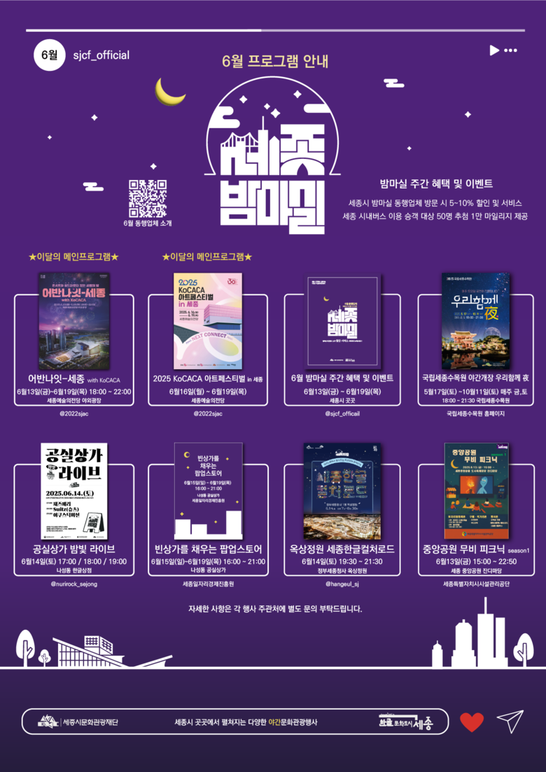 밤마실 주간 할인업체 명단 등 자세한 사항은 시 누리집(sejong.go.kr) 공지사항이나 문화관광재단 인스타그램(instagram.com/sjcf_official)에서 확인하면 된다.