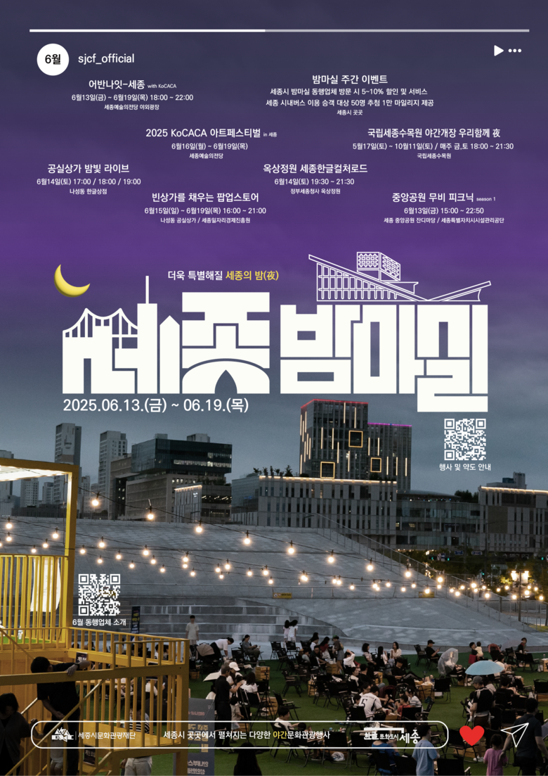 김려수 문화체육관광국장은 “지난 4월에 이어 한층 더 풍성한 프로그램으로 6월 밤마실 주간이 시민 여러분을 찾아갈 것”이라며 “새잼도시 세종에서 모든 시민들이 즐거운 시간을 보내시길 바란다”고 말했다.