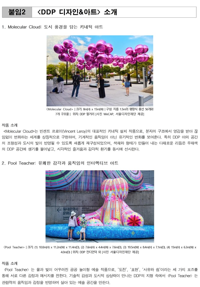 한편 같은 기간 진행된 야외 전시〈 DDP디자인&아트 〉는 프랑스 키네틱 아티스트 뱅상 르로이(Vincent Leroy)의 대형 설치작품 Molecular Cloud와 호주의 인터랙티브 스튜디오 이너스(ENESS)의 Pool Teacher를 선보였다.