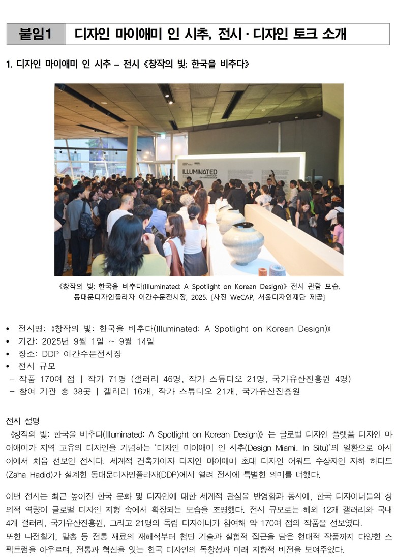 서울디자인재단(대표이사 차강희, 이하 재단)은 아시아 최초로 서울에서 열린 <디자인 마이애미 인 시추(Design Miami. In Situ)>의 전시《창작의 빛: 한국을 비추다》와 야외 전시 < DDP 디자인&아트 >가 지난 9월 14일 성황리에 막을 내렸다고 밝혔다. 두 전시는 총 25만 명의 관람객이 다녀가며 서울이 세계 디자인 문화중심지로 부상하고 있음을 보여줬다.