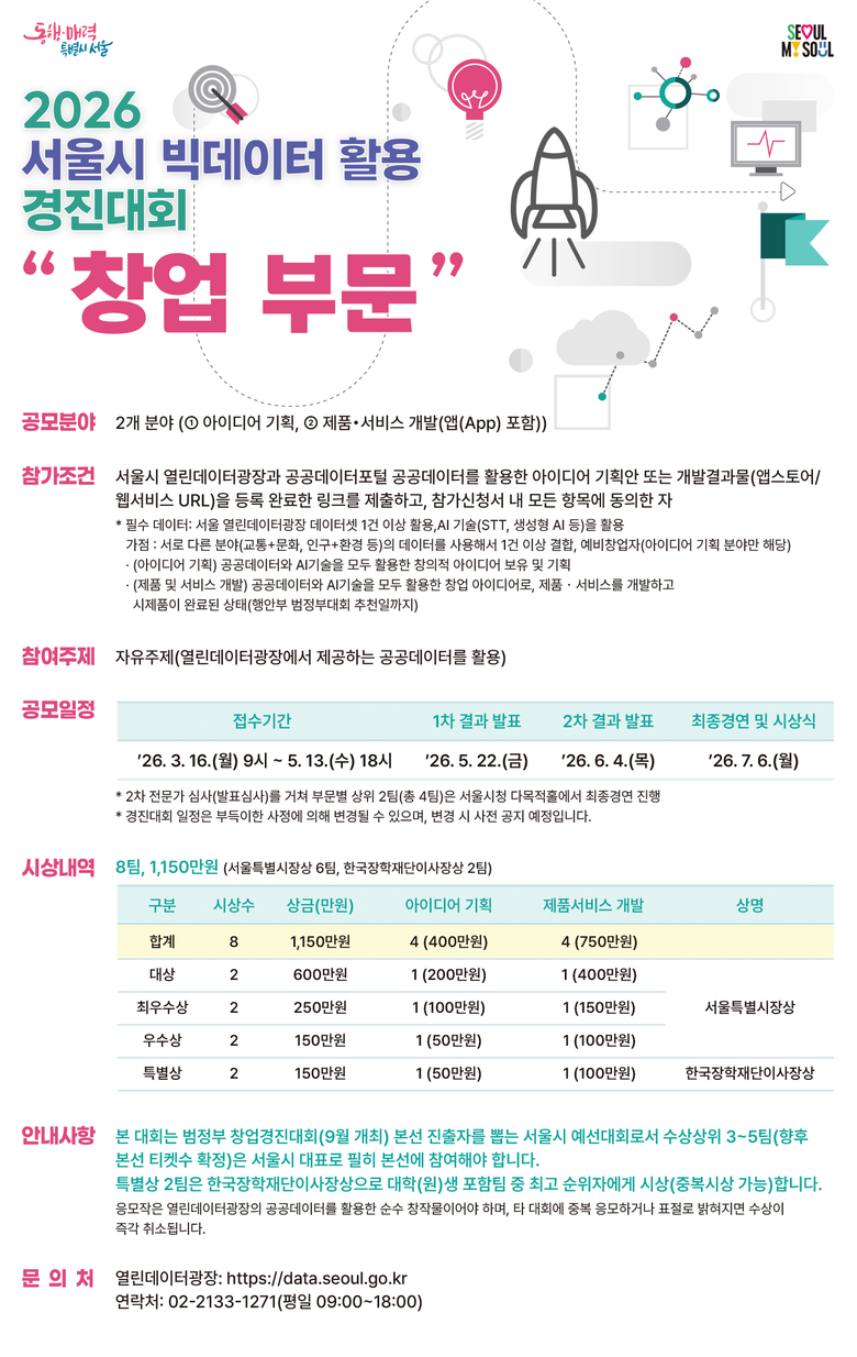 참가 접수는 3월 16일부터 5월 13일까지 열린데이터광장 누리집에서 진행된다. 서울시는 서류 심사와 전문가 평가를 거쳐 6월 초 22개 팀을 선정하고, 7월 6일 서울시청에서 열리는 본선 경연을 통해 최종 수상팀을 가릴 예정이다.