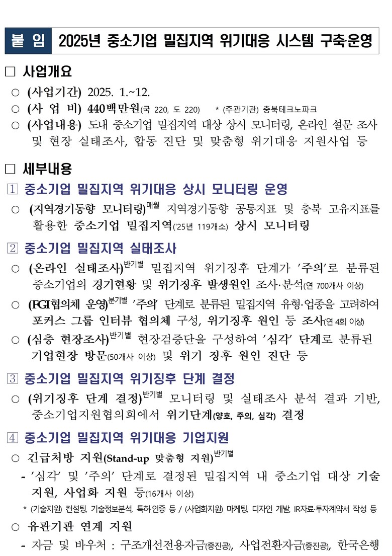 이 사업은 경기 침체, 고용 위축 및 생산성 저하 등 중소기업 현장의 위기 징후를 조기에 포착하고, 신속하고 체계적인 지원을 통해 기업의 위기 대응 역량을 강화하는 데 목적이 있으며 지역 경제의 안정성과 회복 탄력성을 제고할 전략 기반 마련에도 중점을 두고 있다.