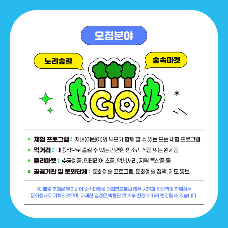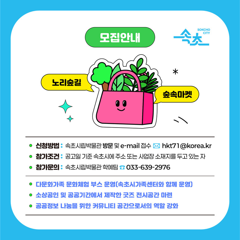 올해 숲속마켓은 가족과 어린이를 대상으로 하는 체험형 부스, 속초 특산물 홍보 및 판매, 로컬푸드 마켓, 시민 홍보 부스 등을 중심으로 구성될 예정이다. 특히, 속초시가족센터와 협력하여 다문화 체험 부스를 운영하며, 다양한 문화를 체험할 수 있는 프로그램도 마련한다.