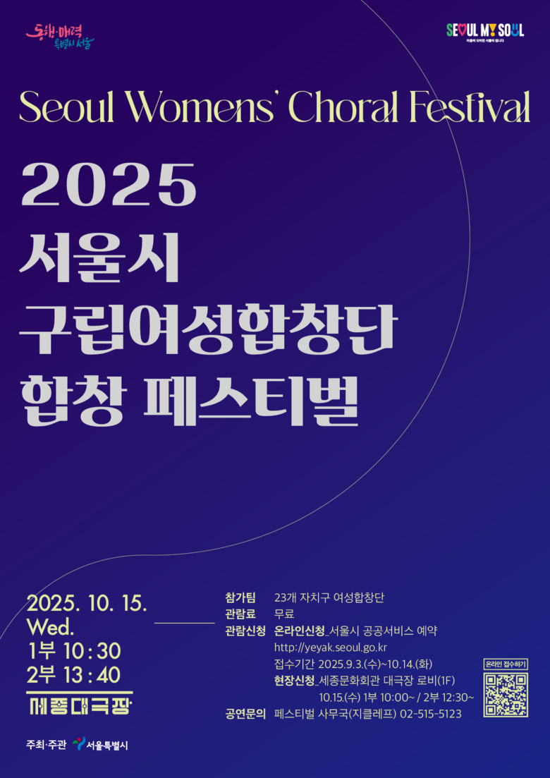 - 전 좌석 무료관람, 서울시 공공서비스예약 통해 사전접수 및 당일 현장 관람도 가능 [서울 세계타임즈=이장성 기자] 서울시는 깊어가는 가을을 맞아 오는 10월 15일(수) 오전 10시 30분부터 세종문화회관 대극장에서 <2025 서울시 구립여성합창단 합창 페스티벌>을 개최한다. 이번 페스티벌에는 서울시 23개 자치구 여성합창단 700여 명이 무대에 올라, 아름다운 화음으로 시민들에게 잊지 못할 감동과 따뜻한 추억을 선사할 예정이다.