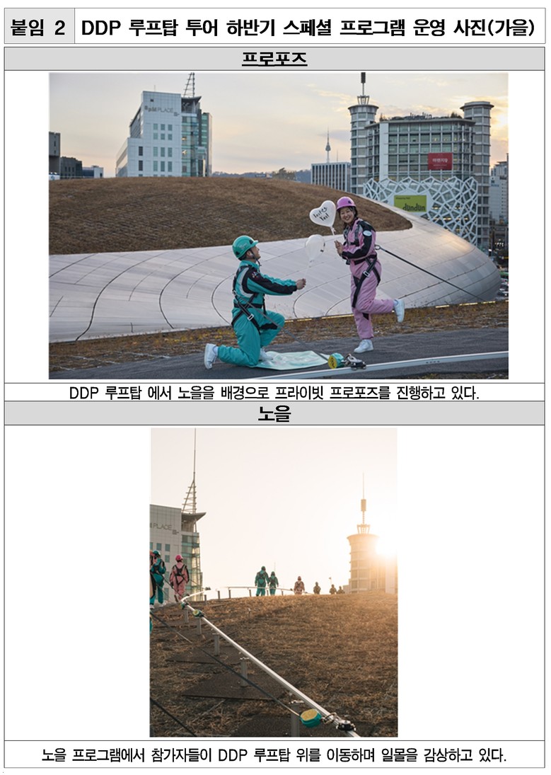 프로포즈 참여자는 “도시 한가운데인데도 완전히 다른 공간에 들어온 느낌”이라며, “앞으로 동대문 일대를 지나가면 ‘우리가 이 위에 올라서 프로포즈를 했었지’하고 그때의 준비 과정과 순간들이 자연스럽게 떠오를 것 같다”고 말했다.
