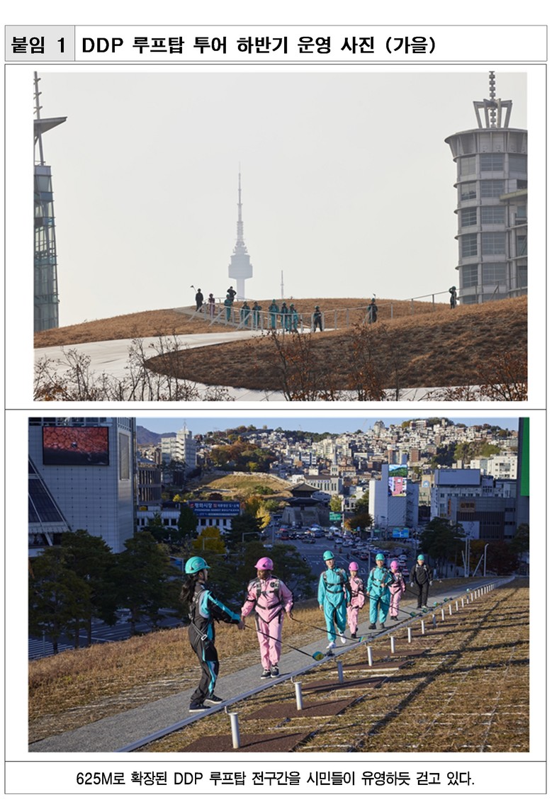 ‘DDP 루프탑 투어’는 안전장치 후 DDP 지붕을 직접 걸으며 서울의 지형·역사·도시 구조를 360도 파노라마로 조망하는 차별화된 체험형 프로그램이다.