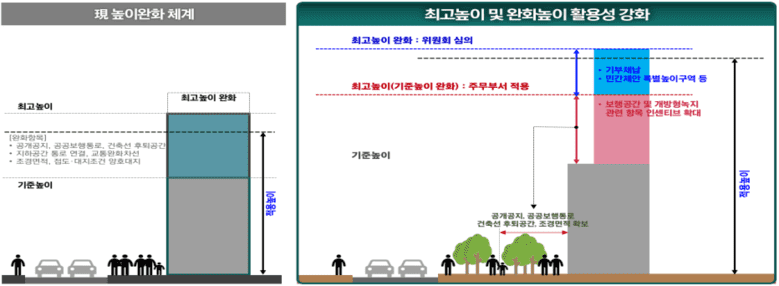아울러, 그간 잘 활용되지 않았던 최고 높이 완화의 활성화를 위해 ▴민간이 직접 ‘특별높이운영구역’을 제안할 수 있도록 하고 ▴기반시설 기부채납 및 공익시설 설치 시 산식을 통해 최고 높이 완화를 의무 적용하여 활용도를 제고할 수 있도록 변경했다.