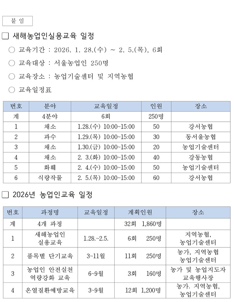 2026년 새해농업인실용교육과 농업인 교육 관련 문의는 서울시 농업기술센터 환경농업팀(전화 02-6959-9366)으로 문의하면 된다.