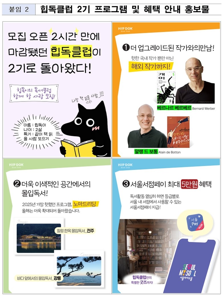 - 개장 특별 프로그램으로 베르나르 베르베르·알랭 드 보통 ‘작가와의 만남’ 진행 [서울 세계타임즈=이장성 기자] 서울시 서울야외도서관 공공 독서클럽 ‘힙독클럽’이 2기 회원 모집에 나선다. 지난해 1기 운영 성과를 바탕으로 올해는 지역서점 상생, 글로벌 작가와의 만남 등 더욱 강화된 내용으로 돌아왔다. 4월 1일(수)부터 서울야외도서관 누리집을 통해 9천 명을 선착순 모집한다.