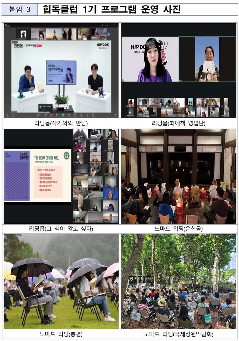 ‘힙독클럽’은 시민들이 온·오프라인에서 함께 책을 읽고 소통하는 서울야외도서관 기반 공공 독서 커뮤니티다.