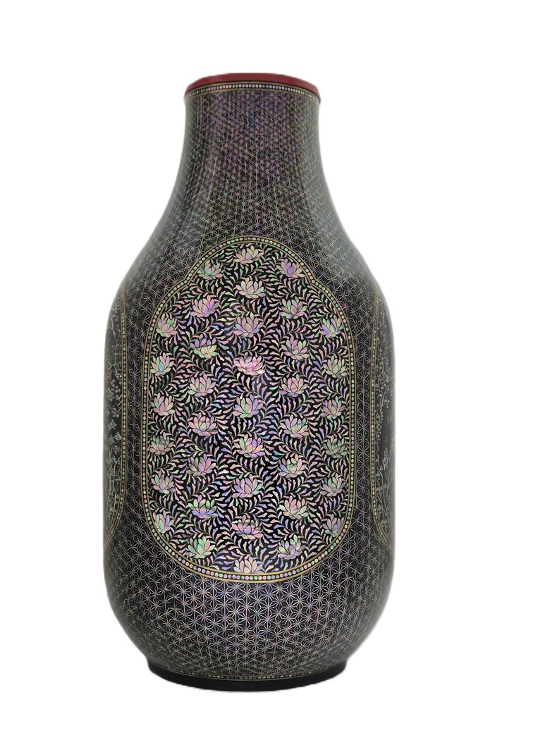 옻칠장과 나전장은 우리의 일상용품을 옻칠로 보호하고 조개껍질로 장식하는 동양 전통 기술이다. 옻칠장 손대현 보유자는 붉은색과 검은색 의 ‘옻칠 합(盒)’ 작품으로 옻칠의 고유한 색채와 광택을 전하며, 나전장 정명채 보유자의 대표작 ‘나전 산수 모란 당초 마엽문 건칠병’으로 섬세하고 신비로운 나전의 예술성을 보여준다.
