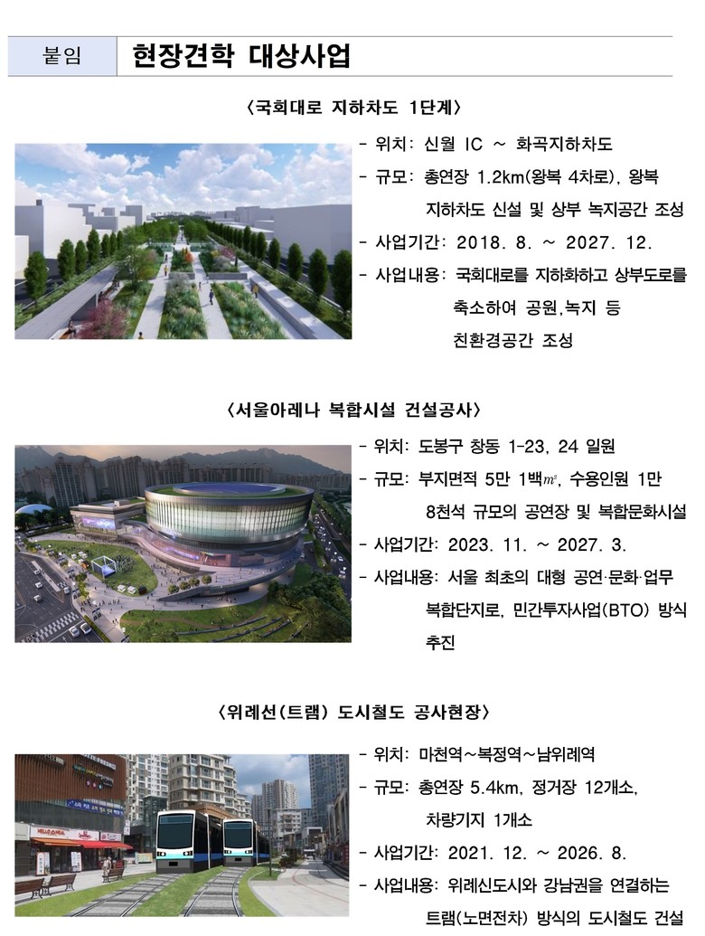 2025년 하반기 시민이 직접 참여하는 현장견학은 국회대로 지하차도 1단계, 서울아레나 복합시설, 위례선 도시철도 공사현장 등 서울시 주요 대형 건설현장을 대상으로 추진된다.
