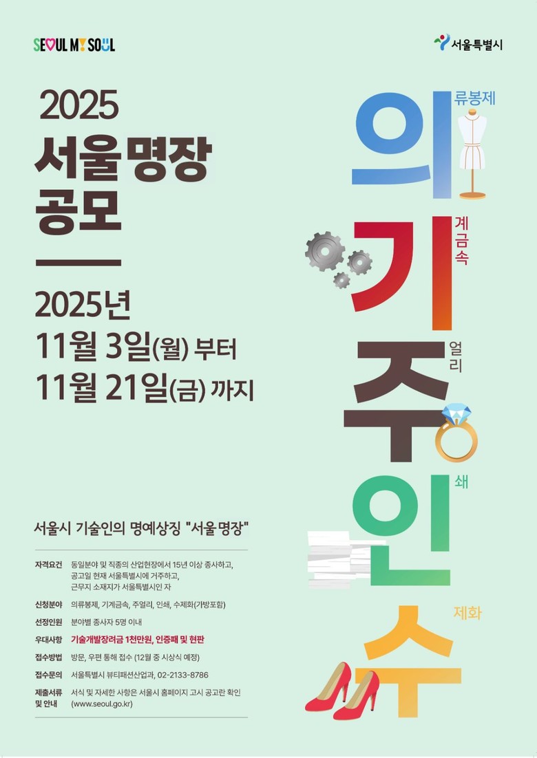 ‘2025 서울 명장’ 지원 자격 및 신청 방법은 서울시 누리집(서울소식>고시·공고)에서 확인하면 된다.