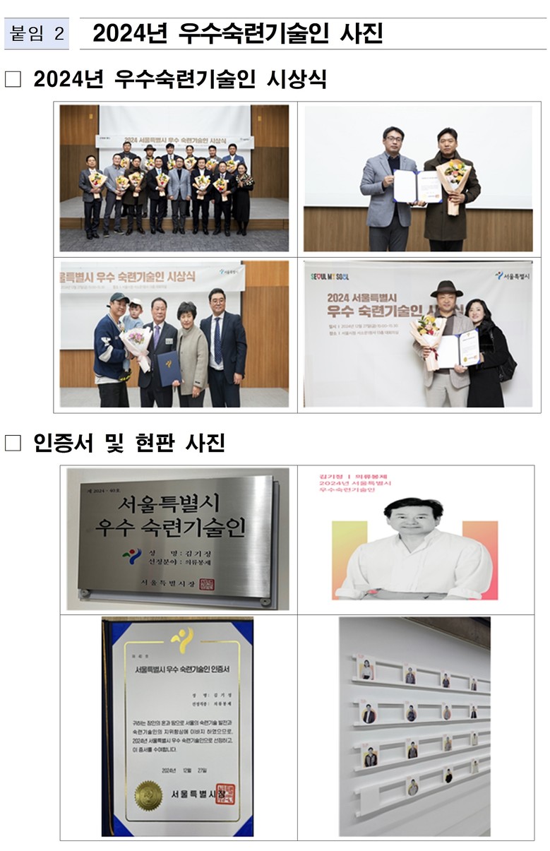 먼저, 명칭이 ‘서울시 우수 숙련기술인’에서 ‘서울 명장’으로 변경됐다. 이는 다른 시·도의 명장 제도와 차별화하면서도, 서울 기술인의 상징성과 명예를 높이기 위한 변화이다. 수상자에게는 기존의 ‘인증서’ 대신 ‘서울 명장 인증패’가 수여돼 기술인으로서의 자긍심을 높이게 된다.