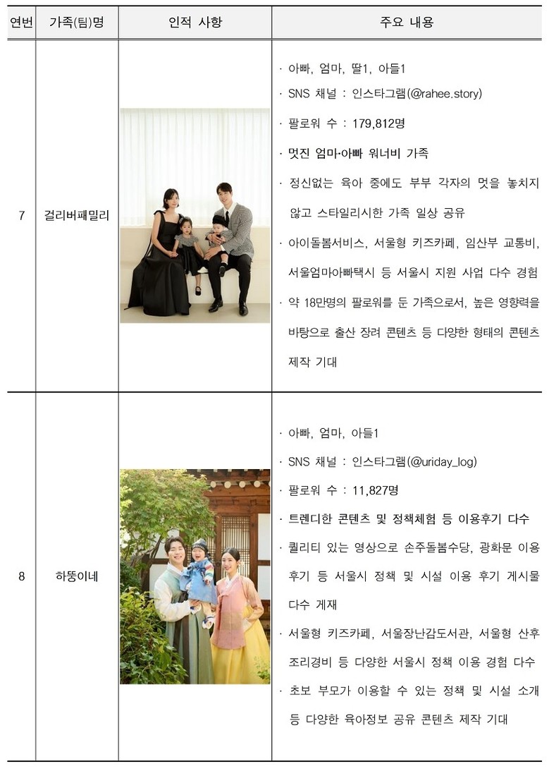 선정된 가족은 ▴인기 가수(레이디제인) 출신이자 늦은 나이에 어렵게 자녀를 출산해 난임부부에게 희망이 되고자 하는 ‘반짝반짝 우주별’ 가족 ▴아이와 함께 운동을 즐기며 몸과 마음이 건강한 육아를 꿈꾸는 ‘베이비하이커’ 가족 ▴효리네 민박 예비부부로 출연해 어느덧 단란한 네 가족을 이룬 ‘조이네민박’ 가족 ▴백색증을 앓고 있는 막내와 든든한 두 오빠의 삼남매 일상을 재미있게 소개하는 ‘우하하패밀리’ 가족 ▴네 자녀와의 일상을 고단함이 아닌 행복으로 그려내는 ‘귭리로루’ 가족 ▴800g 이른둥이 자녀의 양육방법 등을 소개할 ‘라이징썬호우’ 가족 ▴바쁘고 정신없는 육아 중에도 멋을 잃지 않는 ‘걸리버패밀리’ 가족 ▴최신 트렌드에 맞는 콘텐츠를 통해 다양한 육아 정보를 공유할 ‘하뚱이네’ 가족 등 팔인팔색의 매력이 돋보인다.
