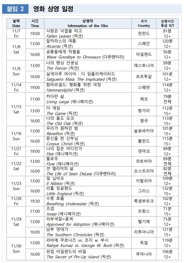 - 유럽 22개국 22편 최신작을 11월 매주 금‧토‧일, 박물관 야주개홀 무료 상영 예정
