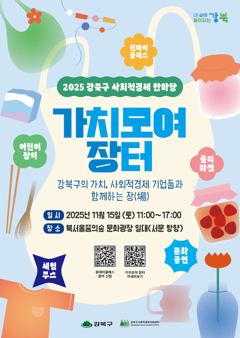 - 사회적경제기업 체험·판매, 원데이 클래스, 지역예술인 공연 등 다채로운 프로그램 마련 [강북구 세계타임즈=이장성 기자] 서울 강북구(구청장 이순희)는 오는 11월 15일(토) 오전 11시부터 오후 5시까지 북서울꿈의숲 문화광장(월계로 173, 서문방향)에서 2025 강북구 사회적경제 한마당 ‘가치모여 장터’를 개최한다.