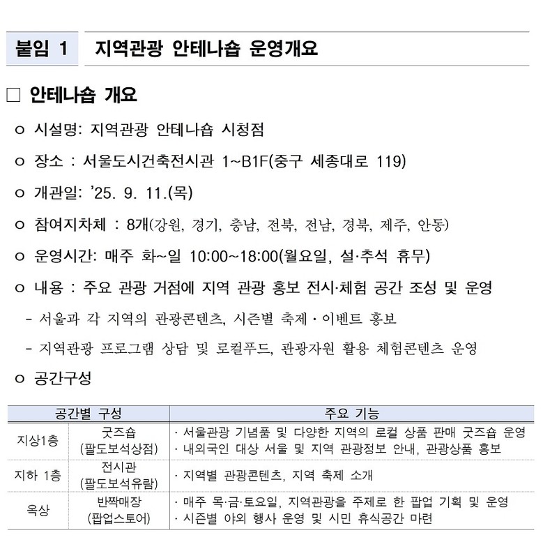 안테나숍은 전국 지자체의 관광자원과 지역 브랜드를 한자리에서 만나볼 수 있는 도심형 지역관광 홍보·체험 및 특산품 판매 복합공간이다. 서울시와 서울관광재단은 시청 인근 서울도시건축전시관(중구 세종대로 119) 내에 지난해 9월 안테나숍을 개관해 운영 중이다.