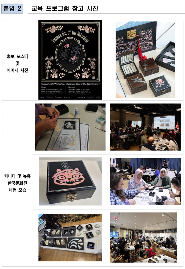 캐나다에 이어 미국 뉴욕에서도 진행된 나전공예 프로그램은 특별제작한 교구 ‘나전공예상자’와 연계하여 뉴욕 한국문화원 최초의 나전공예 체험으로 참여자들의 큰 관심과 호응을 얻었다.
