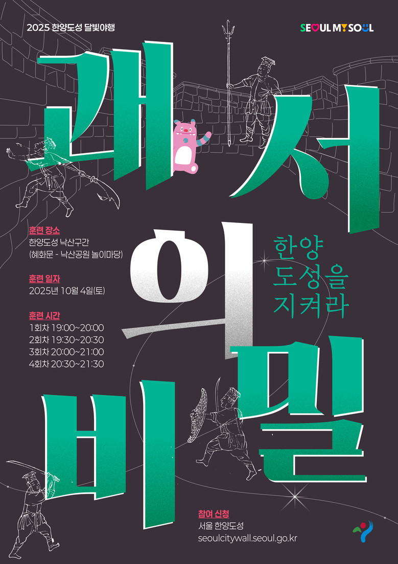 - 9월 17일(수) 오전 10시부터 ‘서울한양도성’ 누 [서울 세계타임즈=이장성 기자] 서울시는 오는 10월 4일(토) 밤, 한양도성 낙산구간에서 ‘한양도성 달빛야행’을 개최한다. 올해 달빛야행은 ‘괘서의 비밀 : 한양도성을 지켜라’를 주제로 몰입형 미션투어로 진행된다. 참가자들은 조선시대 도성수비대가 되어 가짜뉴스의 진상을 파악하고 범인을 추적하는 미션을 수행하게 된다.