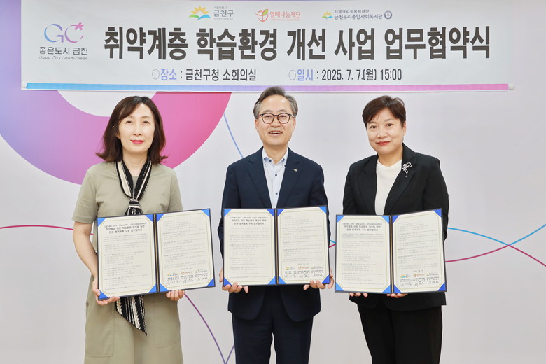 [금천구 세계타임즈=이장성 기자] 금천구(구청장 유성훈)는 관내 취약계층 아동의 학습환경 개선을 위해 사회복지법인 열매나눔재단(사무총장 최운정), 금천누리종합사회복지관(관장 윤명선)과 7일 협약을 체결했다고 밝혔다.