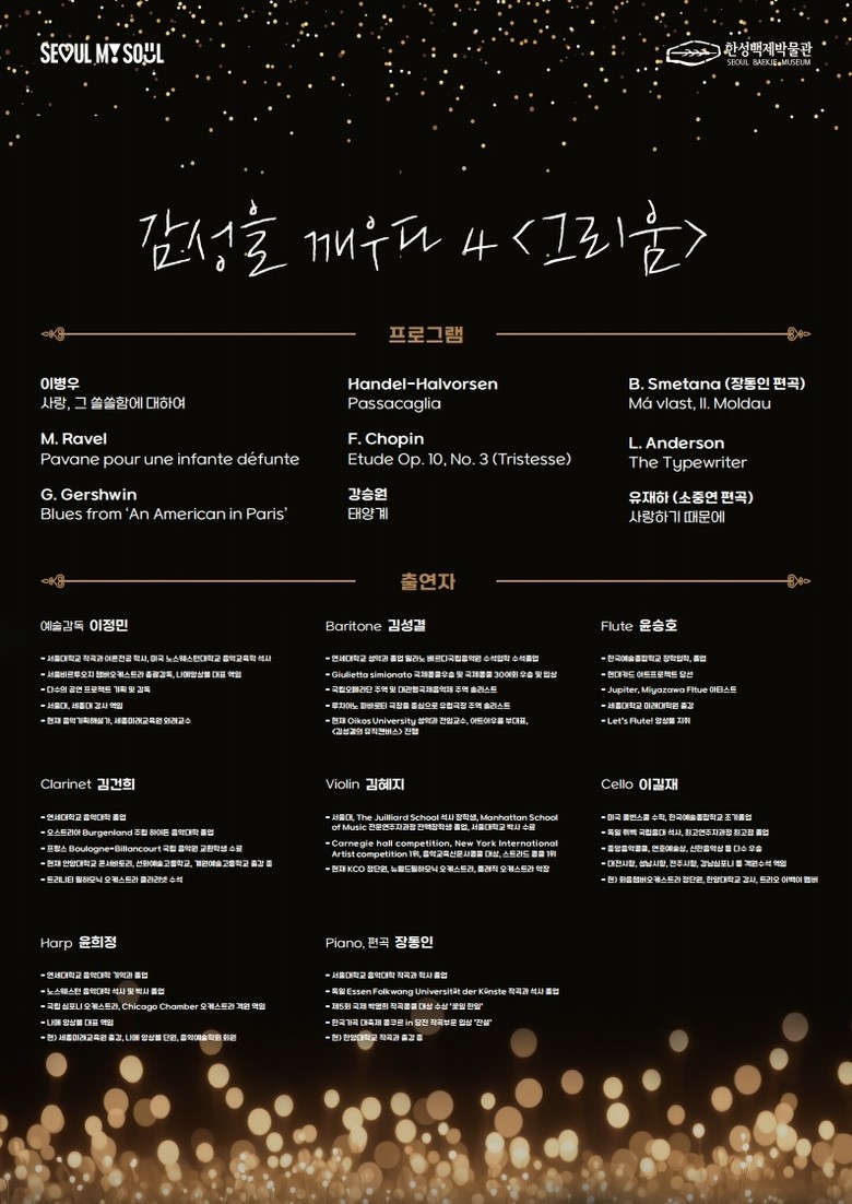 김지연 서울시 한성백제박물관장은 “가을의 끝자락, 시민들이 박물관에서 아름다운 음악으로 따뜻한 감성을 채워가길 바란다”라며 “앞으로도 한성백제박물관은 ‘문화가 일상이 되는 서울’이라는 가치를 실현할 수 있는 다채로운 프로그램을 마련하겠다”라고 말했다.
