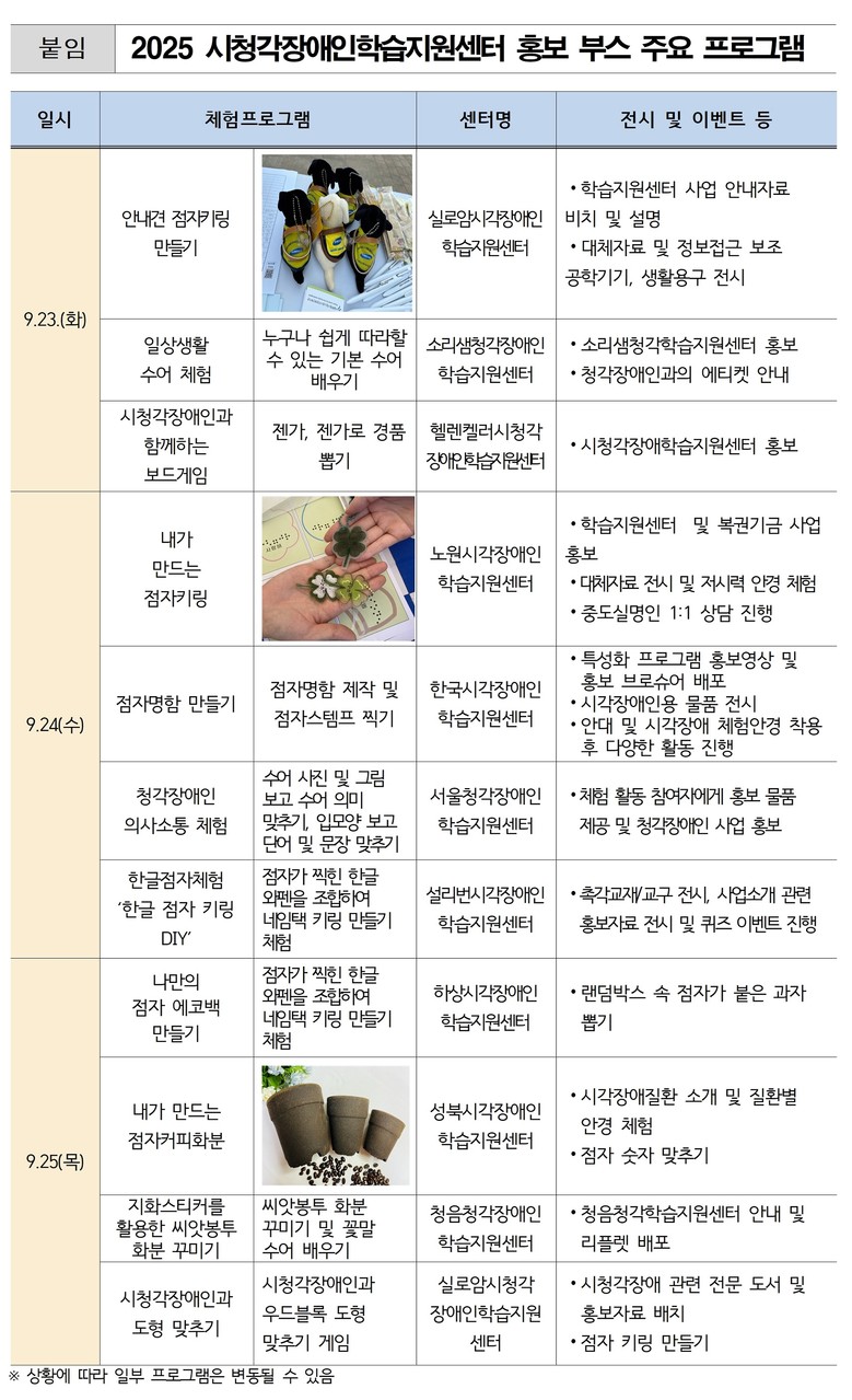 11개 지원센터가 모두 참여하는 이번 홍보부스에는 각 센터의 학습지원 사업과 대체자료를 소개하고 촉각명화(시각장애인이 손으로 직접 만지며 감상할 수 있게 재현된 명화), 보조공학기기 등을 전시한다. 또 재밌고 자연스럽게 점자와 수어를 접할 수 있도록 점자키링, 점자커피화분, 수어단어배우기, 청각장애인 의사소통 체험(그림보고 수어의미 맞추기, 입모양 보고 단어 맞추기) 활동 등이 진행된다.
