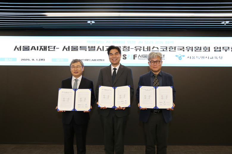 [서울 세계타임즈=이장성 기자] 서울AI재단(김만기 이사장)은 9월 1일(월) 오전 10시, 서울AI스마트시티 센터에서 서울특별시교육청, 유네스코한국위원회과 함께 책임 있는 AI 활용을 위한 업무협약(MOU)을 체결했다.
