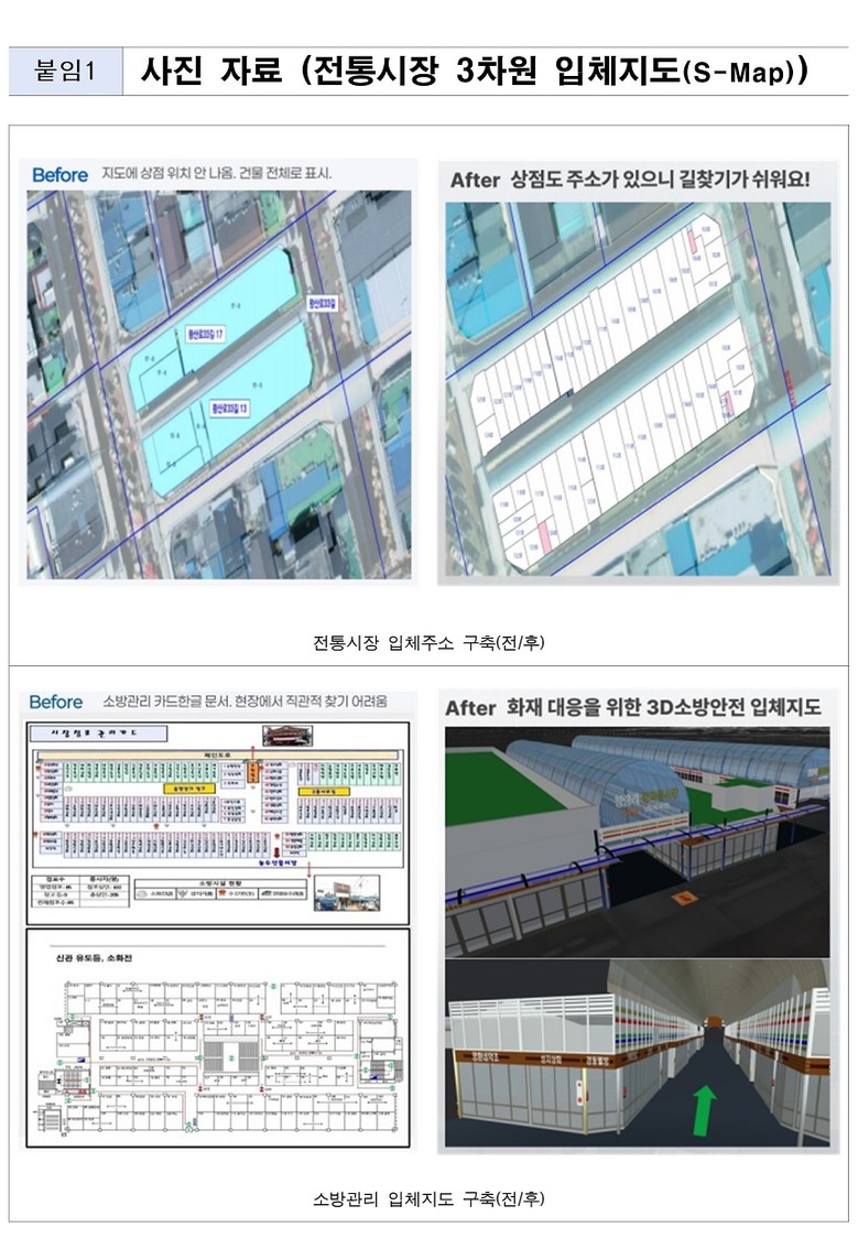 위성기반 위치정보(GNSS)와 레이저 기반 3차원 측량 기술(LiDAR) 등 고정밀 공간정보 기술을 활용해 시장 내부 통로와 점포, 주요 시설물의 정확한 위치 좌표를 확보하고, 이를 기반으로 3차원 입체지도를 구축했다.