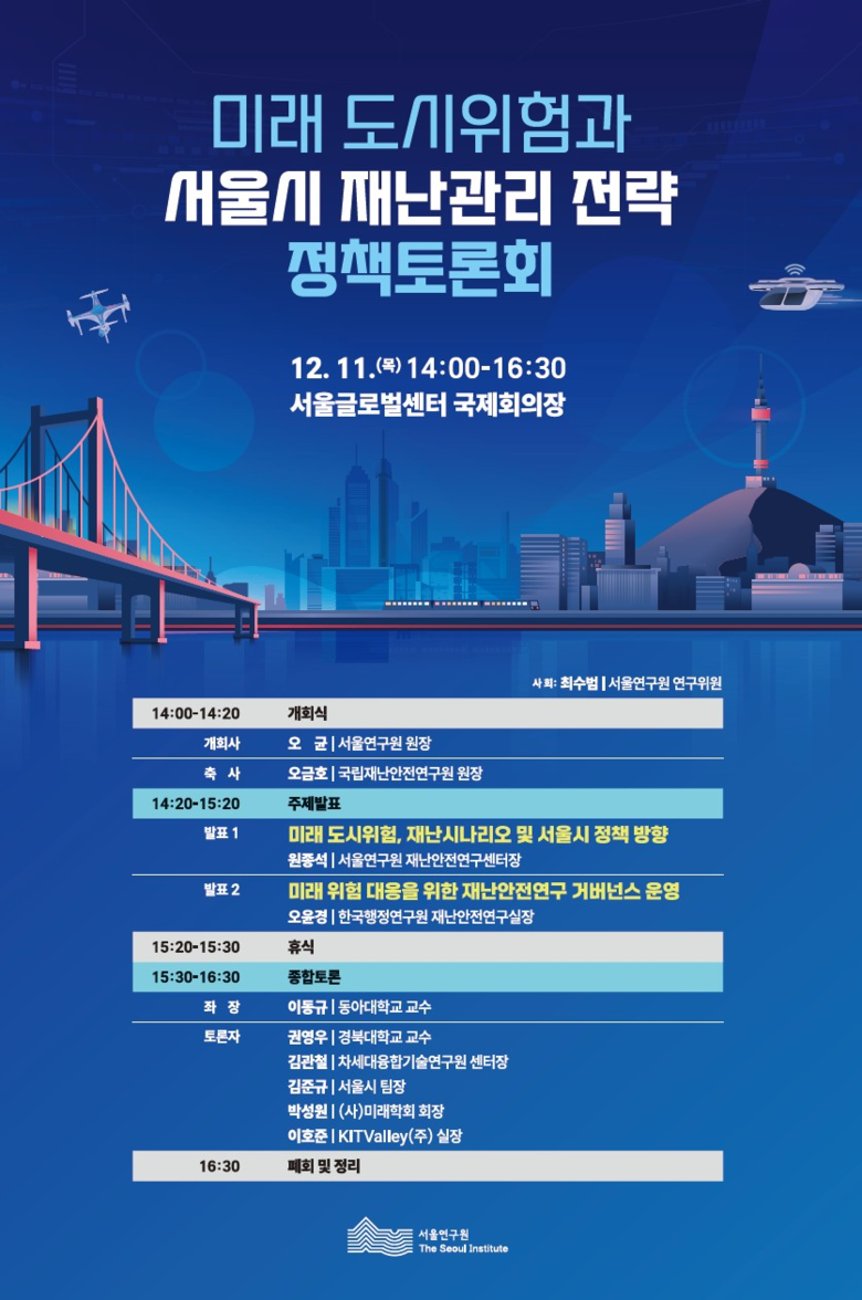 주제발표에서는 연구책임자인 원종석 서울연구원 재난안전연구센터장이 서울의 미래 도시위험 특성과 재난 시나리오, 서울시 재난관리체계의 한계와 개선 방향을 발표한다. 이어 오윤경 한국행정연구원 재난안전연구실장이 미래 위험 대응을 위한 재난안전연구 거버넌스 운영 등을 제안한다.