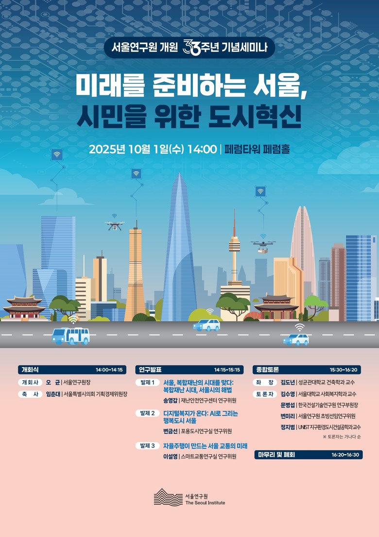 이번 세미나는 서울연구원 개원 33주년을 기념해 복합재난 대응, 디지털 복지, 자율주행 교통 등 급변하는 도시환경 변화 속에서 서울이 향후 나아가야 할 혁신 전략과 정책적 해법을 모색하기 위해 마련한 자리이다.