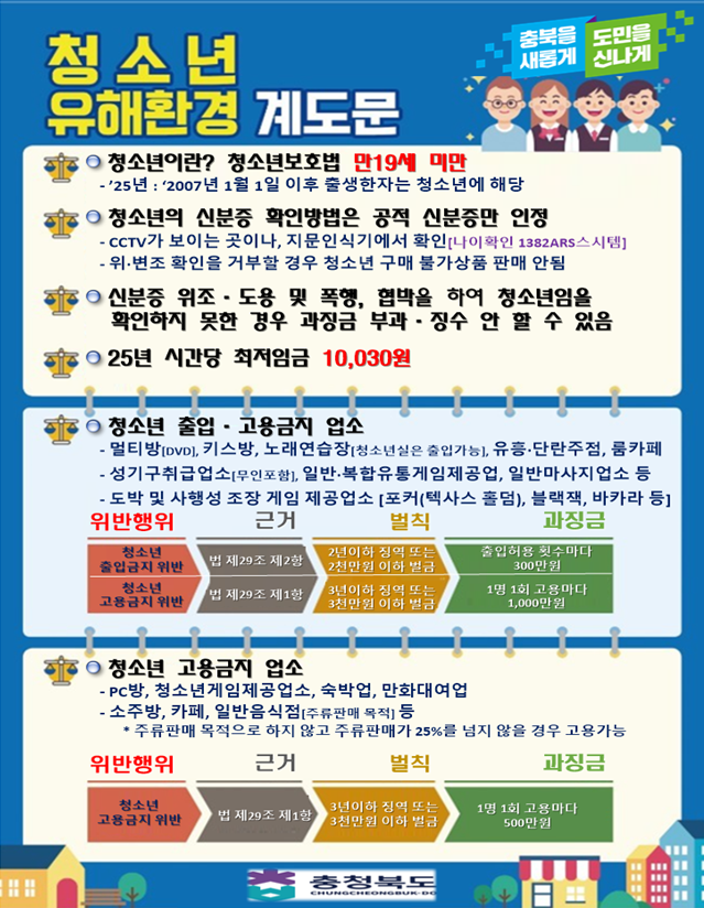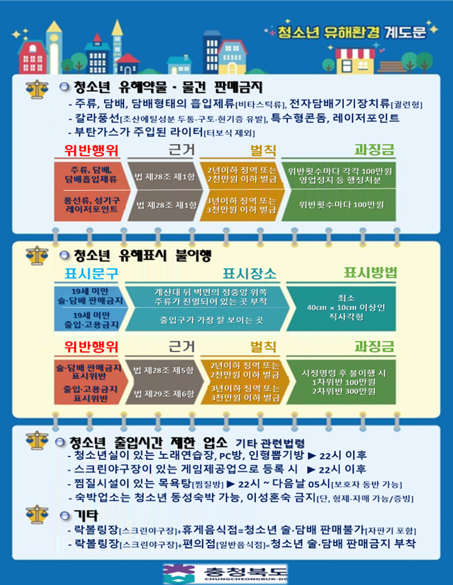 충북도는 매년 개학기, 가정의 달, 수능이후 등 청소년이 건강하고 안전하게 성장할 수 있도록 유해업소들의 불법적 행위를 수시로 단속하고 있다.
