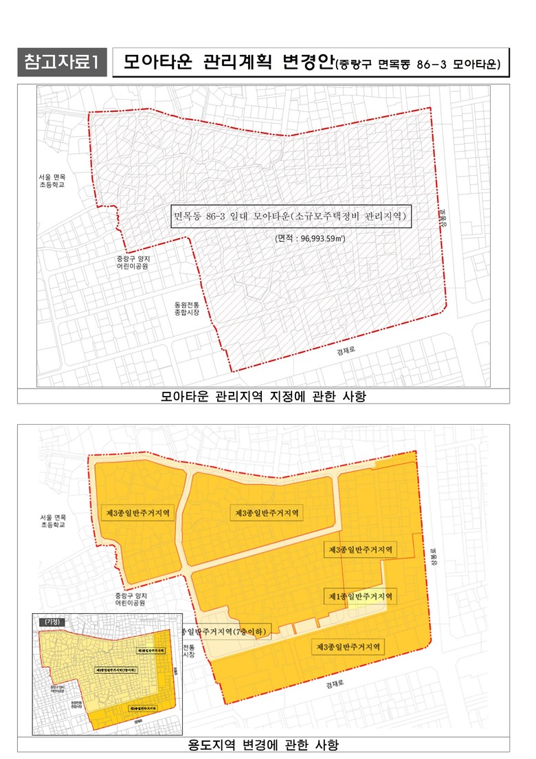 중랑구 면목동 86-3 일대는 노후 다가구‧다세대주택 밀집 지역으로 주차장.녹지.편의시설 부족 등으로 생활여건이 열악한 곳으로 강북구 번동과 함께 당시 시범사업지로 선정되어 면목역과 간선도로로 둘러싸인 약 9.7만㎡ 지역에 대해 관리계획을 수립하여 ‘모아타운’으로 지정(‘22.12.22.), 현재 모아주택 사업 4개소가 본격 추진되는 곳이다.
