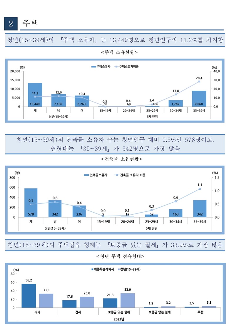 세종에 거주하는 청년 중 주택을 소유한 청년은 1만 3,449명으로, 주택 점유형태는 보증금이 있는 월세 33.9%, 자가 33.3%, 전세 25.8% 순이었다.