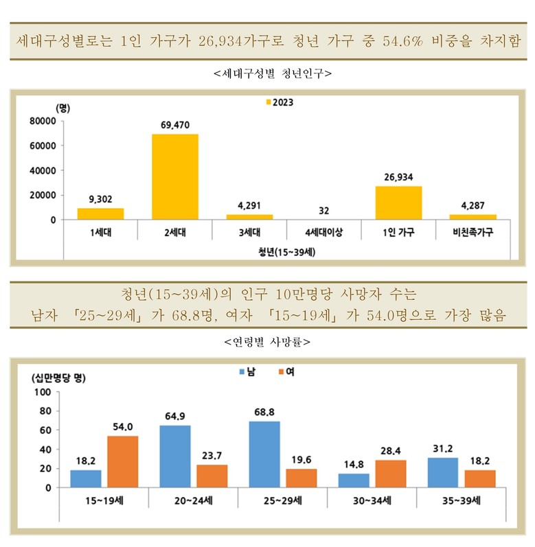 이번 청년통계는 2023년 말 기준 세종시에 주민 등록된 만 15세 이상 39세 이하의 청년을 대상으로 ▲인구·가구 ▲주택 ▲복지 ▲고용·소득 ▲건강 등을 조사해 작성됐다.